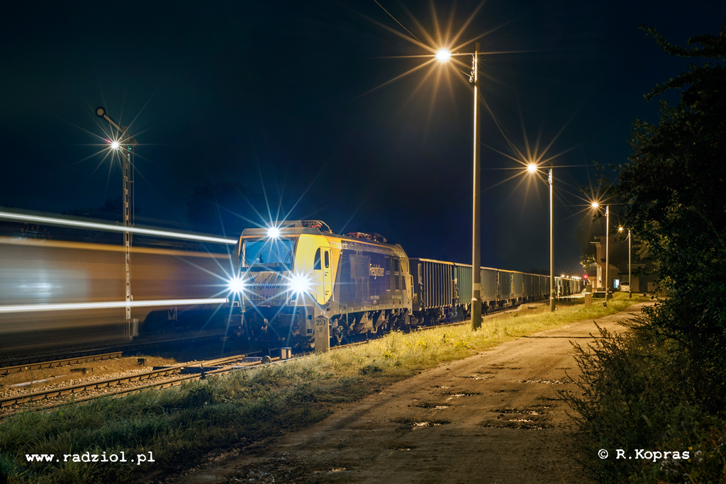 Po wjeździe skład pociągu zostanie podstawiony na jedną z kilku tutejszych bocznic w celu załadunku kruszywem. Zanim to jednak nastąpi, należy przepuścić pociąg towarowy w kierunku Legnicy – widoczny jest jedynie w formie smugi – czas naświetlania tego zdjęcia to blisko 30 sekund.