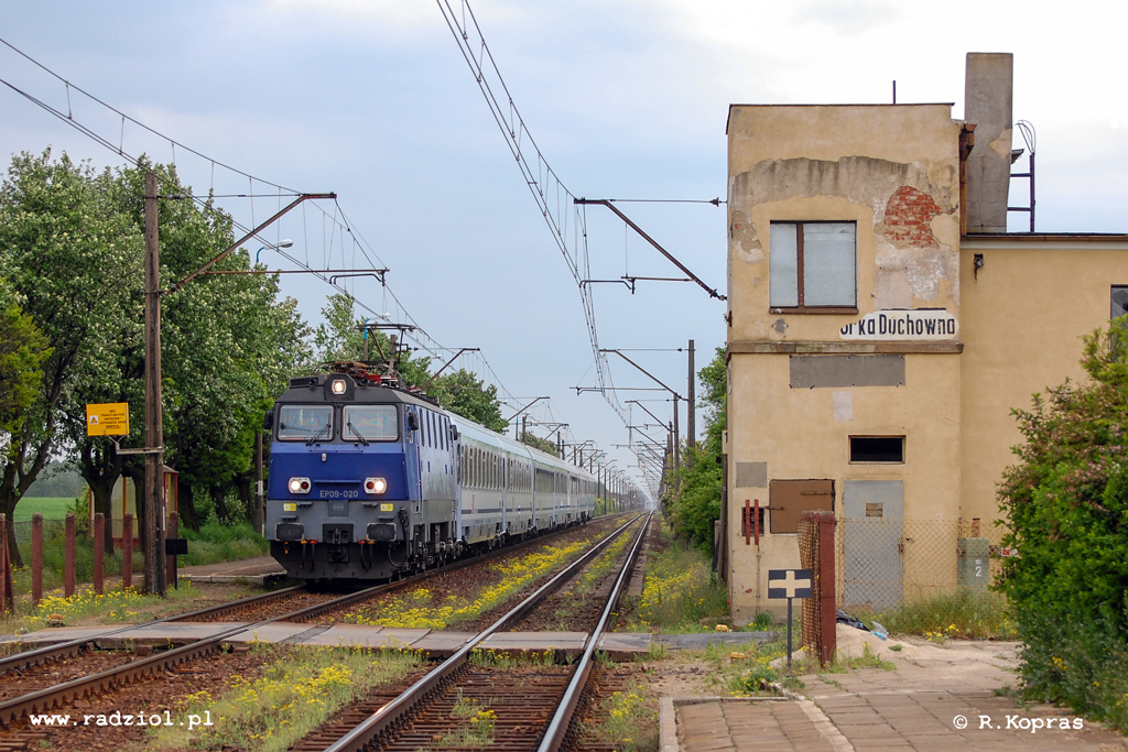 Piątego maja wracałem drogą krajową numer pięć z Leszna do Poznania. Pamiętam, że ruch był bardzo duży i wlokąc się kilka kilometrów za sznurem aut usiłującym wyprzedzić jakąś maszynę rolniczą postanowiłem odpuścić i skręciłem w boczną drogę zatrzymując się w Górce Duchownej. Przy torach straszył budynek mieszczący kiedyś posterunek ruchu – o ile mi wiadomo był tutaj posterunek odstępowy. Z racji braku innego schronienia dla podróżnych ustawiono wiaty przystankowe, dające pewne schronienie przy niepogodzie. Na horyzoncie pojawiły się światełka, więc wyciągnąłem aparat i zrobiłem powyższe zdjęcie. Widzimy na nim EP09-020 z jednym z flagowych wówczas na tej linii „ekspresów” do Warszawy. Podróż „Panoramą” z Wrocławia do Warszawy przez Poznań trwała „tylko” pięć i pół godziny – dziś dzięki poprawie warunków na alternatywnych trasach można się dostać z Wrocławia do Stolicy nawet w 3 godziny i 40 minut. Lokomotywa ma niebieskie barwy, jednak bez jakichkolwiek oznaczeń przewoźnika – to pamiątka po przejściowym okresie, gdy wiadomo już było, że lokomotywy zostaną przeniesione z PKP Cargo do PKP Intercity, ale to drugie nie miało jeszcze zatwierdzonego żadnego konkretnego schematu kolorystycznego dla pojazdów trakcyjnych.