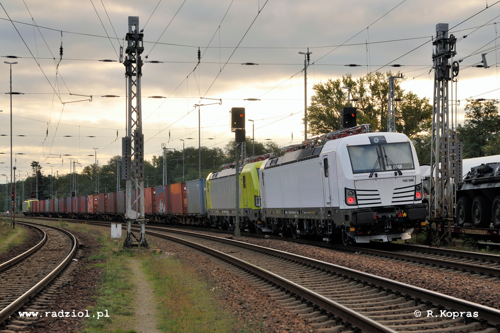 Kolejny przykład tego, że w roboczym plecaku zawsze warto znaleźć miejsce na aparat fotograficzny. Tego dnia rozpoczynając pracę na granicy polsko-niemieckiej moją uwagę zwrócił ciekawie zestawiony pociąg. Na czele platform z kontenerami zobaczyłem nowego Vectrona w malowaniu sugerującym przyszłego właściciela – Alpha Trains. Na końcu składu znajdowała się druga maszyna w identycznych barwach, a na końcu trzecia – tym razem biała. W oknach wszystkich znajdowały się kartki formatu A4 z numerami fabrycznymi i konfiguracjami – rzecz charakterystyczna dla lokomotyw Siemensa opuszczających fabrykę.