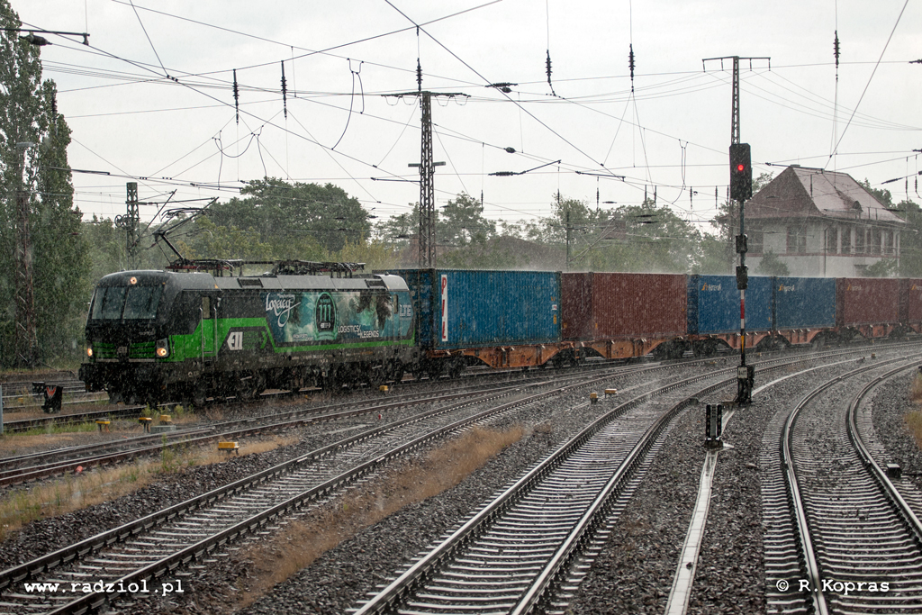 Tego dnia cały dzień padało. Deszcz towarzyszył mi od rana do późnego popołudnia. Oczekując na odjazd z Frankfurtu nad Odrą w kierunku Eisenhüttenstadt obserwowałem wjazd pociągu kontenerowego z Polski. Znana mi już maszyna z LTE wyjątkowo pasowała do tej mokrej aury. Widywałem ją już wcześniej w barwach ELL – w czerwcu 2019 aktualny użytkownik (LTE) przyozdobił jej boki ciekawą grafiką.