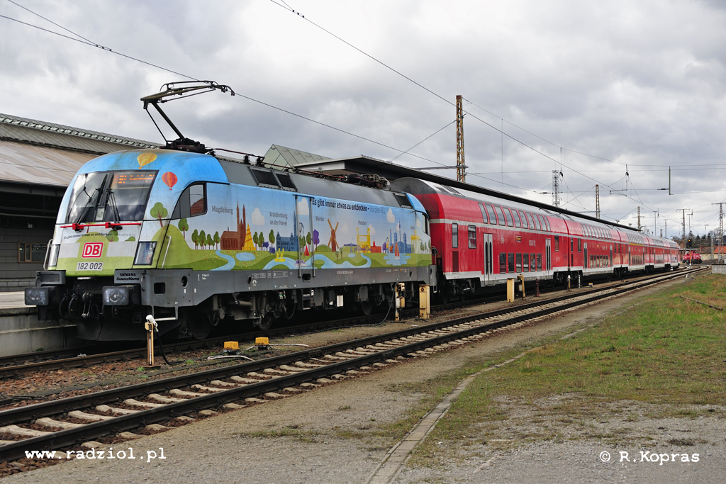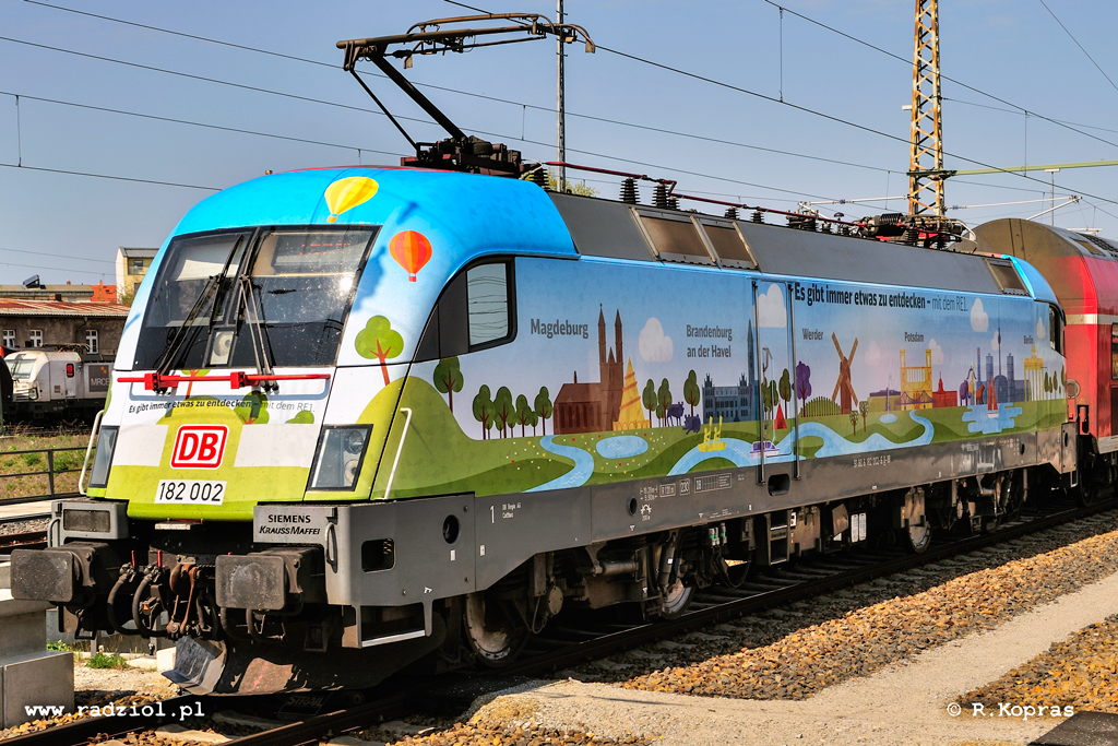 Druga strona pojazdu ozdobiona jest grafikami: Erkner, Furstenwalde/Spree, Frankfurt/Oder, Eisenhuttenstadt, Neuzelle i Cottbus. Całość prezentuje się bardzo ładnie i estetycznie i zachęca do turystycznych wyypraw linią zazwyczaj wykorzystywaną przez dojeżdżających do pracy i szkoły. Wkrótce minie pięć lat od kiedy możemy podziwiać kolorową lokomotywę z pociągami RE1. W międzyczasie dołączył do niej jeszcze drugi pojazd z kolorową grafiką – „Fontanna Teodora” – ale o tym napiszę już w osobnym poście.