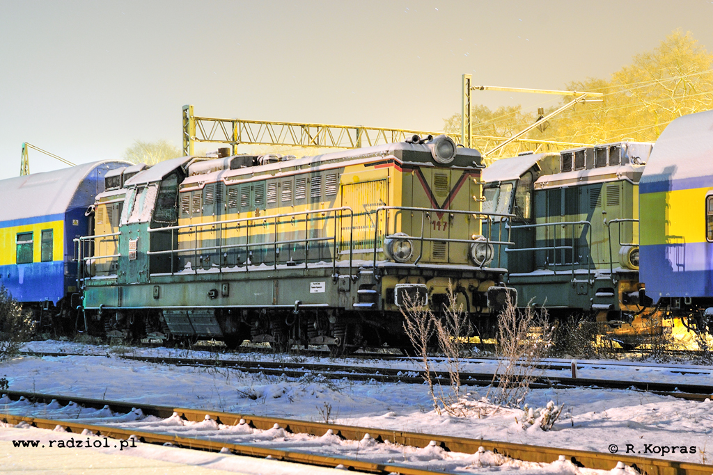 7 grudnia 2012 |Krzyż Wlkp.| SP32-147 odstawiona na terenie lokomotywowni „Przewozów Regionalnych”. Po prawej widoczny fragment SP32-073