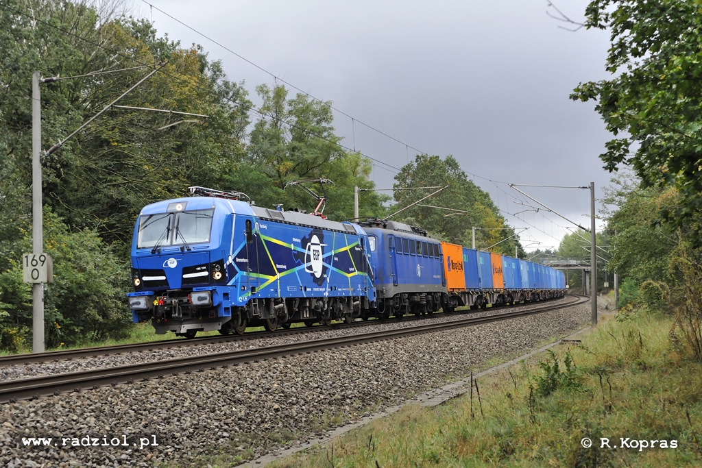 25 września 2019 |Ludwiglust| Smartron przewoźnika „Eisenbahngesellschaft Potsdam” (numer boczny 104) w tandemie z lokomotywą serii 140 prowadzi skład kontenerowy w kierunku Hamburga.