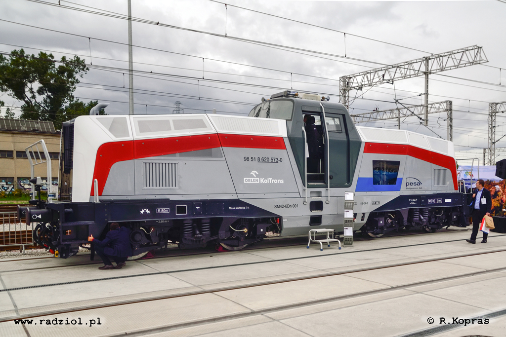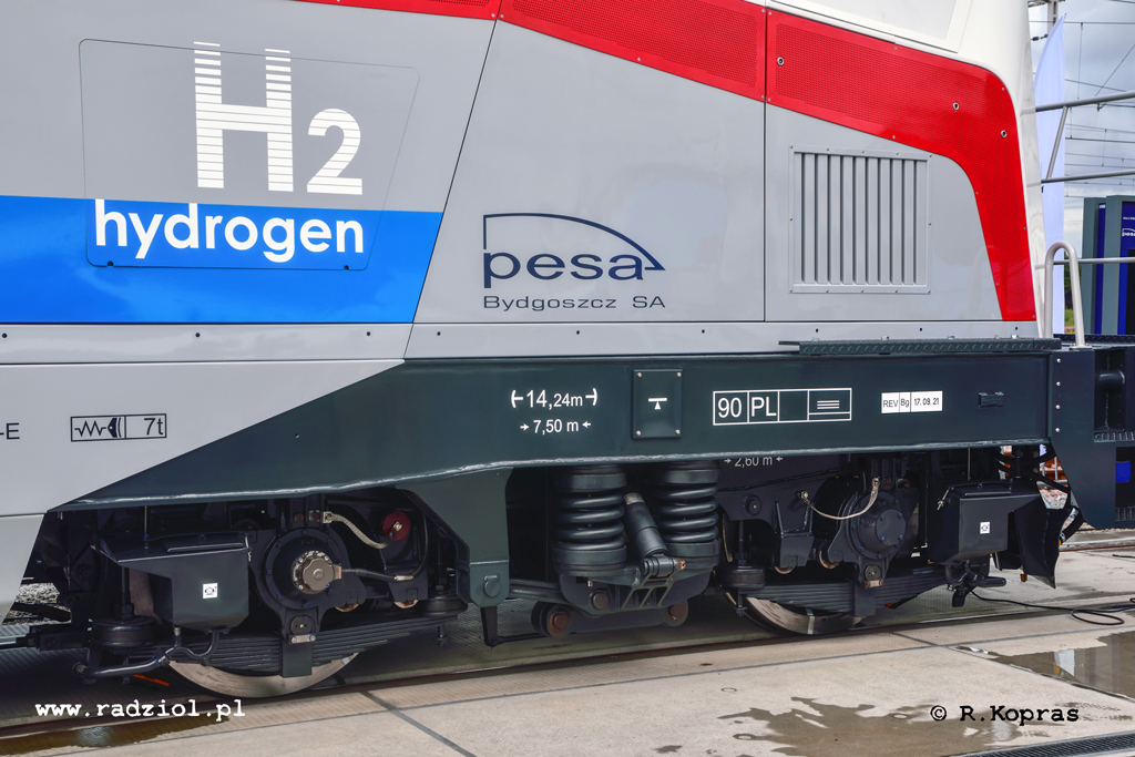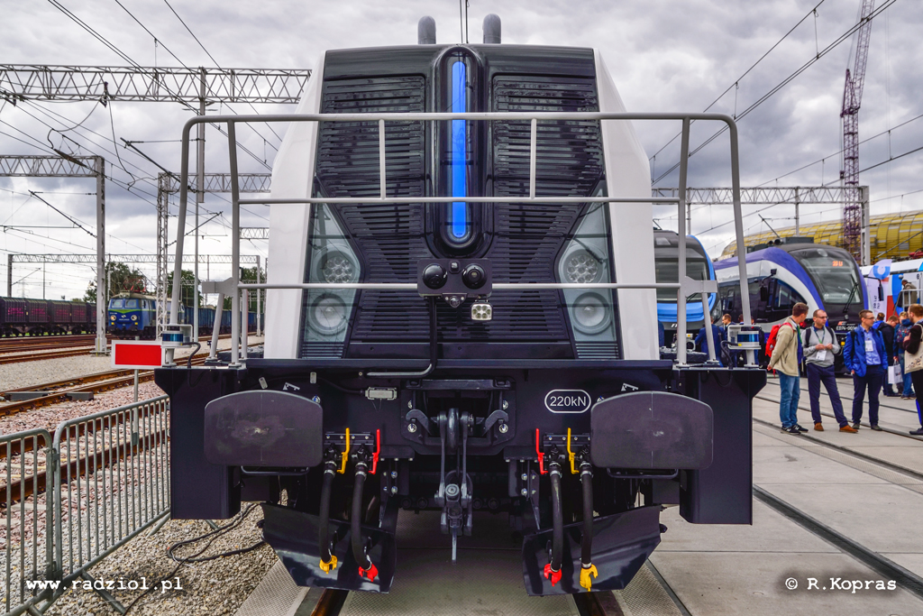 Jedna z najbardziej oczekiwanych premier i jeden z najchętniej oglądanych pojazdów na wystawie plenerowej w tym roku na targach kolejowych Trako to prototyp lokomotywy manewrowej z napędem wodorowym. Stworzony na bazie polskiej lokomotywy manewrowej serii SM42 (typ 6D). Pierwszym zaskoczeniem jest właśnie to, że wykorzystano ostoję i układ biegowy od lokomotywy rodem z lat siedemdziesiątych. Dzisiejsze rozwiązania układów biegowych ze sprężynami śrubowymi i hamulcami tarczowymi można by łatwo adaptować do takiego pojazdu – widziałbym tu chętnie na przykład wózki jak choćby w Gravitach od Voith – byłoby to dopełnieniem tej nowoczesnej konstrukcji. A tak – pierwsze, co rzuca się w oczy na podwoziu to resory piórowe i prędkość konstrukcyjna 90km/h. Ale jak się nie ma co się lubi…