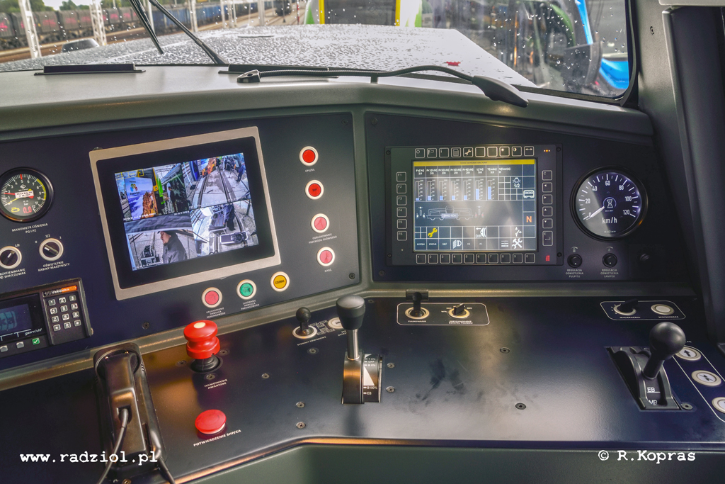 Przyjrzyjmy się jeszcze samej kabinie: – wewnątrz znajdują się dwa stanowiska maszynisty oraz mały kącik socjalny. Kabina jest klimatyzowana. Aby poprawić widoczność, pojazd wyposażono w wiele kamer – dających obraz tego, co dzieje się wokół lokomotywy, ale także monitorujących to, co dzieje się w kabinie.