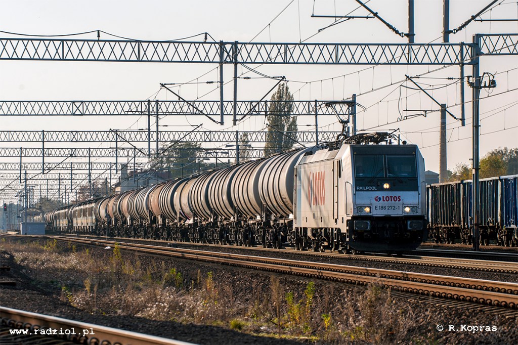 15 października 2017 |Nowy Tomyśl| E186-272 ze składem zmierza w kierunku Poznania. W środku składu wpięto osiem belgijskich elektrowozów.