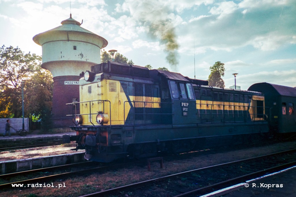 Ostatni dzień kalendarzowego lata. Jedno z moich wielu zdjęć zrobione na odchodnym – po opuszczeniu w Międzyrzeczu pociągu ze Zbąszynka odczekałem jeszcze chwilę, aby obserwować odjazd składu w przeciwnym kierunku. Lokomotywy serii SP32 były moimi ulubionymi i bardzo lubiłem słuchać charakterystycznego dźwięku silnika spalinowego w trakcie wchodzenia na obroty. Tego dnia wyciągnąłem z torby analogową „małpkę” Kodaka, by zrobić zdjęcie – niestety pod słońce – postarałem się tylko zakryć je wieżą ciśnień. Po dwudziestu latach zeskanowałem ponownie negatyw i udało się coś „wyciągnąć” z cieni – mam wrażenie, że udało się nawet w pewnym stopniu uchwycić nietypowy odcień lokomotywy o numerze 091 – jej zieleń była bardzo ciemna, barierki oraz tabliczki również pomalowano w tym samym kolorze i całość zlewała się w ciemną bryłę z bladożółtym akcentem. Lokomotywę z profilu dało się rozpoznać z daleka i sprawiała wrażenie ponurej i brudnej. Nie były to już czasy planowej obsługi i nikt nie dbał o kolorowe detale – tak jak było to przyjęte jeszcze kilkanaście lat wcześniej – wtedy każda ze stacjonujących tu lokomotyw tej serii była wyjątkowa i wyróżniała się na tle innych.