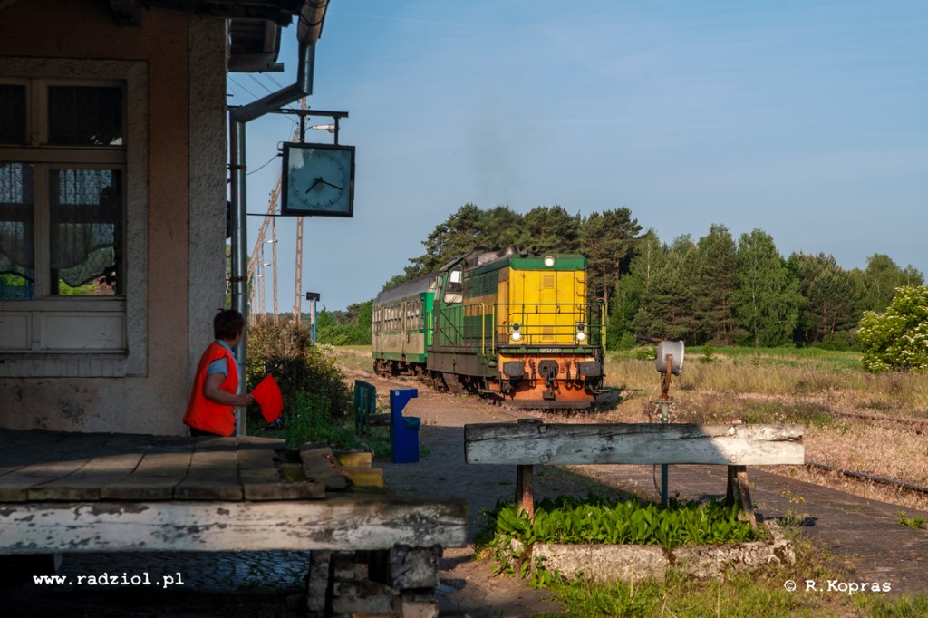Stobno to przystanek osobowy pomiędzy Trzcianką i Piłą – kiedyś była tutaj stacja – do dziś zachowały się budynki nastawni wykonawczej od zachodniej strony oraz fragmenty torów głównych dodatkowych, a także sygnalizacji kształtowej. Nastawnia dysponująca była zlokalizowana w przybudówce budynku stacyjnego – dziś urzęduje tu dróżnik przejazdowy. I to właśnie jego postać widzimy na zdjęciu – chorągiewką daje maszyniście sygnał D8 – stwierdzenie obecności dróżnika na przejeździe.