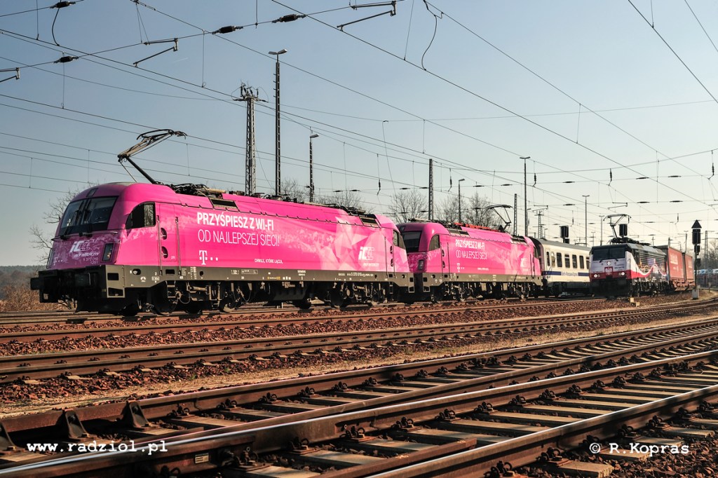 W marcu 2015 roku udało mi się sfotografować skład złożony z dwóch oklejonych lokomotyw. Powyższe zdjęcie wykonałem po zakończeniu pracy w Oderbruecke – stacji granicznej na terenie Niemiec, na której następuje zmiana systemu zasilania oraz aktywacja niemieckiego systemu bezpieczeństwa (PZB). Widoczny po prawej skład z ES64F4-213 oddałem niemieckiemu koledze, który poprowadził go w kierunku holenderskiej granicy.